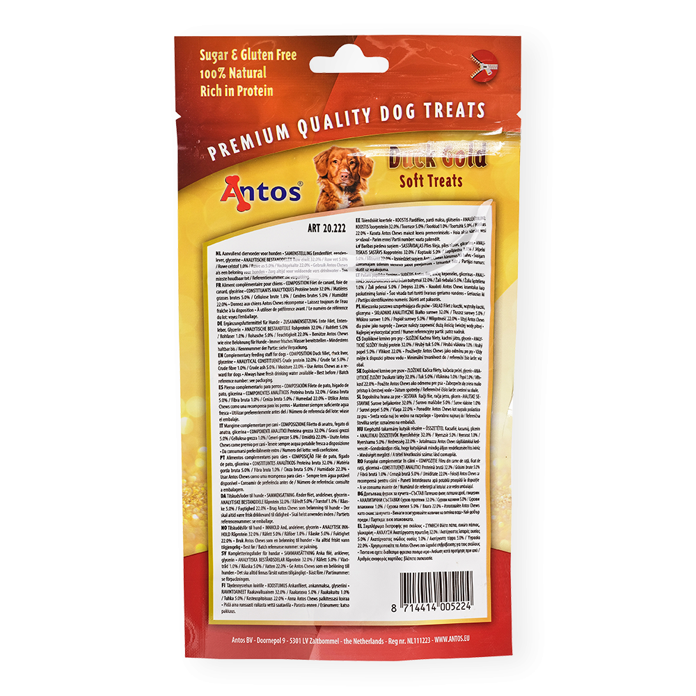 Antos Duck Gold sind köstliche, natürliche Hundeleckerlis, mit echtem Entenfleisch; sie sorgen dafür, dass Ihr Hund muskulös und schlank bleibt. Diese natürlichen und getreidefreien Leckereien sind die perfekte Ergänzung zu Trocken- und Dosenfutter für Hunde.