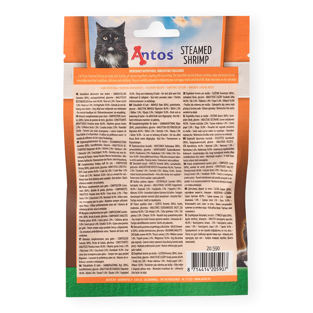 Verwöhnen Sie Ihren Stubentiger mit dem dekadenten Geschmack von Garnelen. Unsere Cat Treats Steamed Garnelen enthalten als erste Zutat Garnelen, die als hochwertige Protein- und Aminosäurequelle zum Aufbau und Erhalt der Muskulatur Ihrer Katze beitragen. Die zuckerfreien Leckerlis eignen sich hervorragend für alle Lebensphasen.