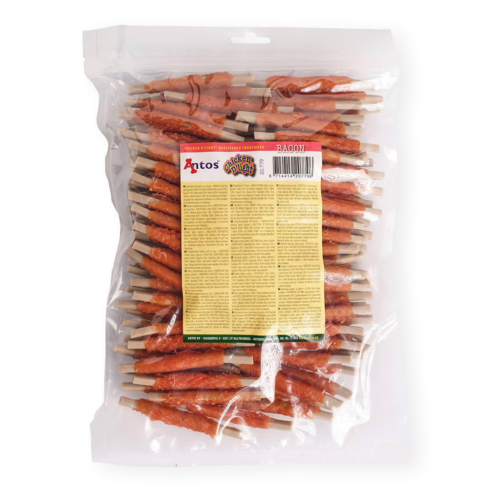 Eine echte Fleischdelikatesse, die Ihrem Hund das "Mmmh" ins Gesicht zaubern wird. Chicken D'light Bacon wird aus köstlichem Hähnchenfleisch hergestellt, das um eine Speckstange gewickelt ist. Ihr Hund wird sich für diese getreidefreien, schmackhaften Leckerlis begeistern können.