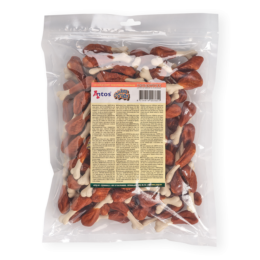 Verwirklichen Sie die Träume Ihres Hundes mit Chicken D'light Drumsticks. Diese köstlichen Belohnungen bestehen aus Hühnerbrust, die um einen Kalziumknochen gewickelt ist. Perfekt für große oder kleine Hunde: Diese Leckerlis werden jeden "Kumpel" erfreuen.