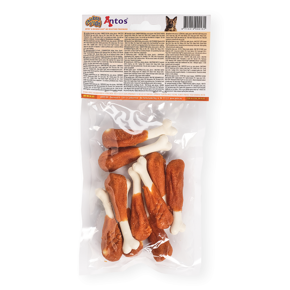 Unsere Chicken D'light Drumsticks schmecken köstlich und haben sich die Treue unzähliger Hunde "erkämpft". Die Leckerlis bestehen aus Kalziumknochen, die in Hühnerfleisch eingewickelt sind.