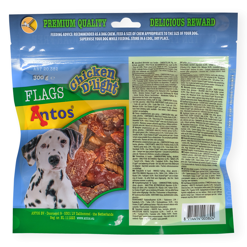Lassen Sie Ihren Hund seine Leckerlis selbst aussuchen - er wird sich ganz sicher für Chicken D'light Flags entscheiden! Dieses klassische Leckerli ist aus zartem Hähnchenbrustfleisch hergestellt, das um eine Rohhautstange gewickelt wurde: ein spannendes und hochwertiges Leckerli.