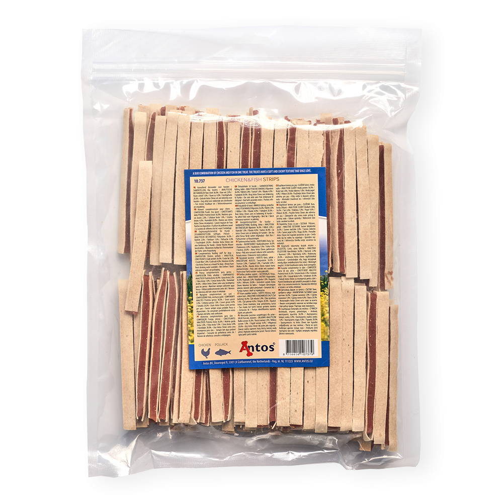 Hergestellt aus echtem Hühnerfleisch und gesundem Fisch: Unsere Chicken&Fish Strips tragen dazu bei, die Zähne Ihres Hundes sauber und gesund zu halten. Mit einem Geschmack, den Hunde lieben werden, stellen diese Leckerlis die ideale Belohnung für Ihren geliebten Begleiter dar.