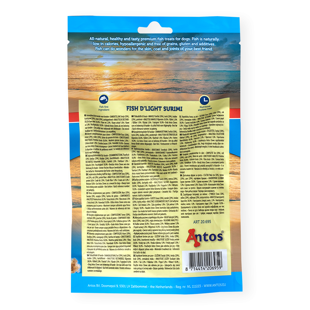 Zaubern Sie Ihrem Hund etwas Köstliches in den Napf mit Fish D'light Surimi. Sie enthalten ein unwiderstehliches Krabben- und Thunfisch-Consommé. Vollgepackt mit Phosphor und reich an essentiellen Vitaminen und Omega-Fettsäuren zur Versorgung der Haut Ihres Hundes. Ein nahrhaftes Leckerli für Ihre Fellnase!
